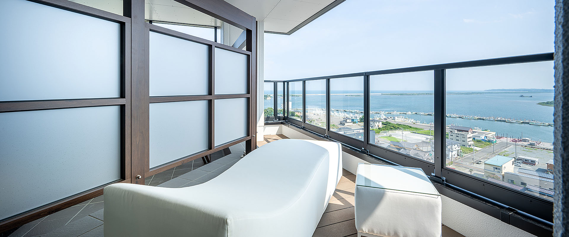 最上階 9Fの1フロアに1室だけの客室。太平洋、松川浦、仙台湾や金華山、太平洋を航行するフェリーや数々の船舶など360°の眺めが望めます。